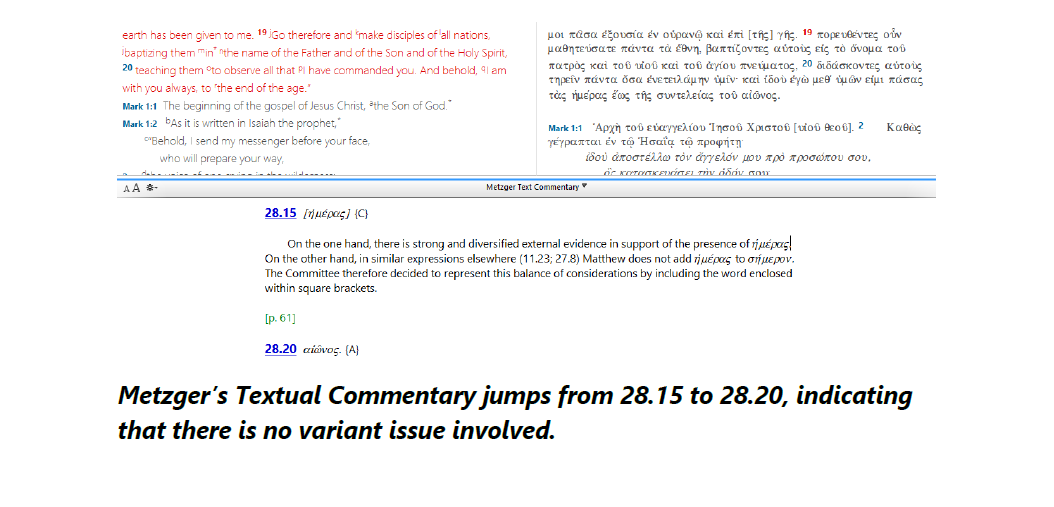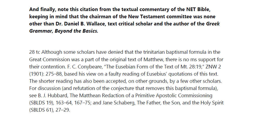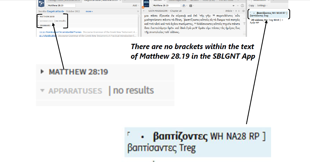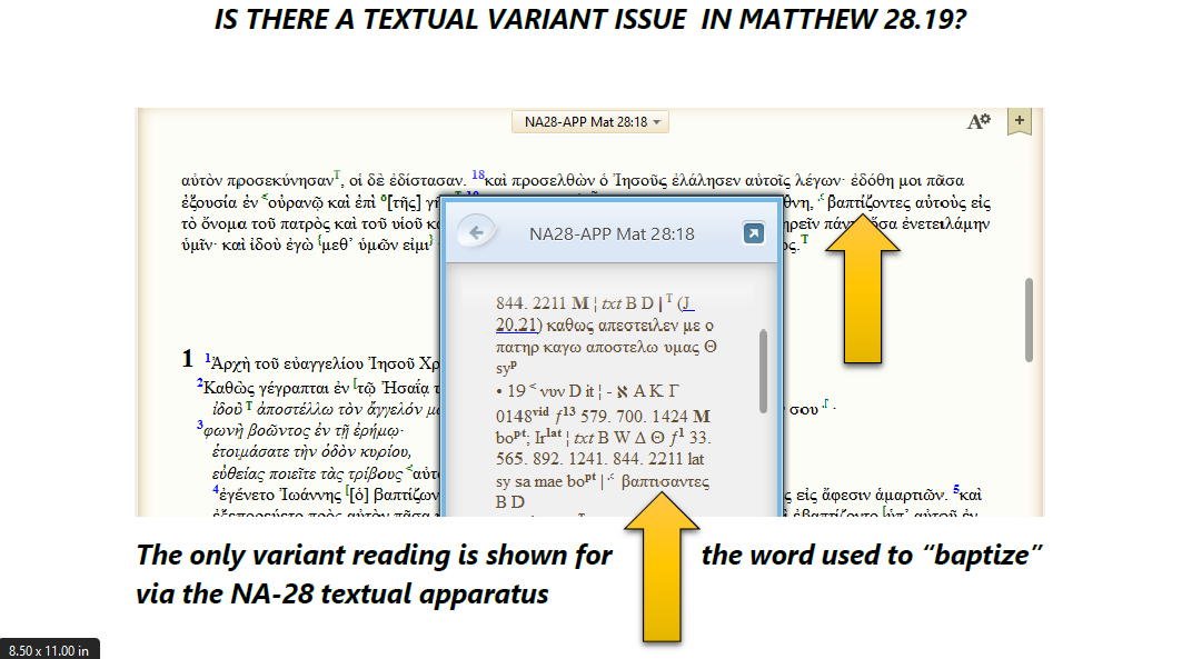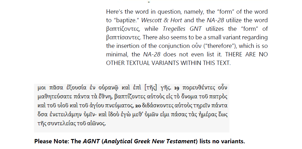 Today, I was contacted by a friend and asked if there were any textual variants in Matthew 28.19 that would draw into question baptizing in the singular name of the Father, Son and Holy Spirit. Below is the textual data from this study and as you will see, while it is true that some folks deny that we should baptize via the Triune formula, it is likewise true that this argument cannot be generated via the text of Matthew 28.19 itself.